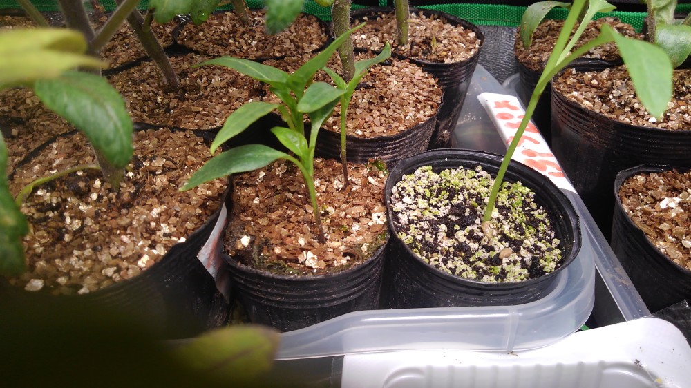 左手前の4つのポットはなかなかうまく発芽しないもの。様子見のポットです。