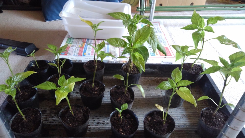 以前にミニトマト、ナスの一部の鉢上げをしたのですが、気力が尽きてピーマン、万願寺唐辛子の鉢上げはできませんでした。