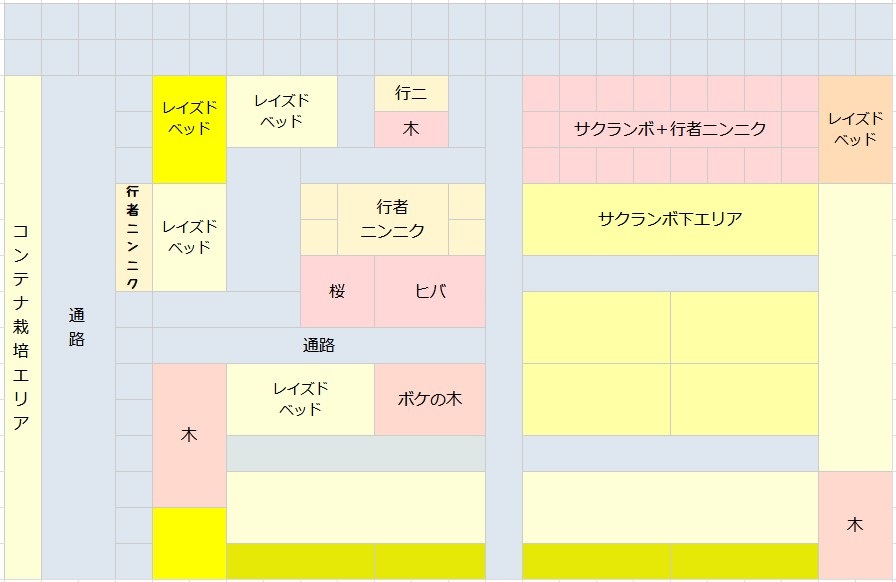 上にあげた画像がうちの畑の概略図なんですが、ところどころに木が植えられていて全面畑にするのが難しい状況です。