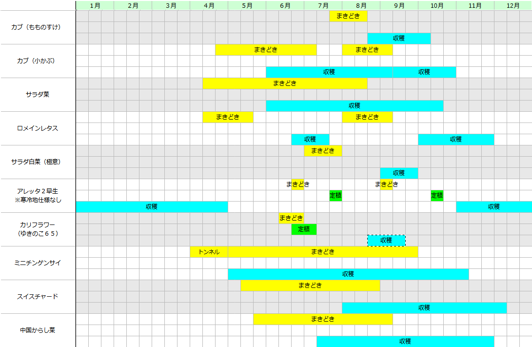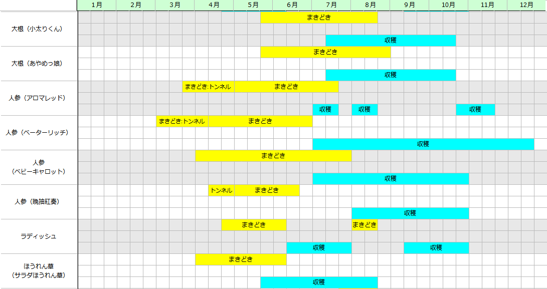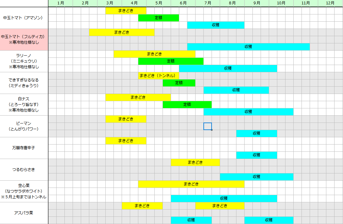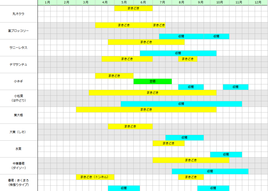 畑に直播する野菜もありますが、そうでない野菜についても定植時期の記載されていないものあり、ここら辺については実際に栽培をしていくうえで修正します。