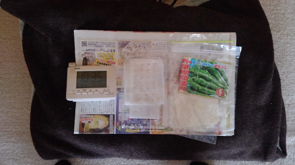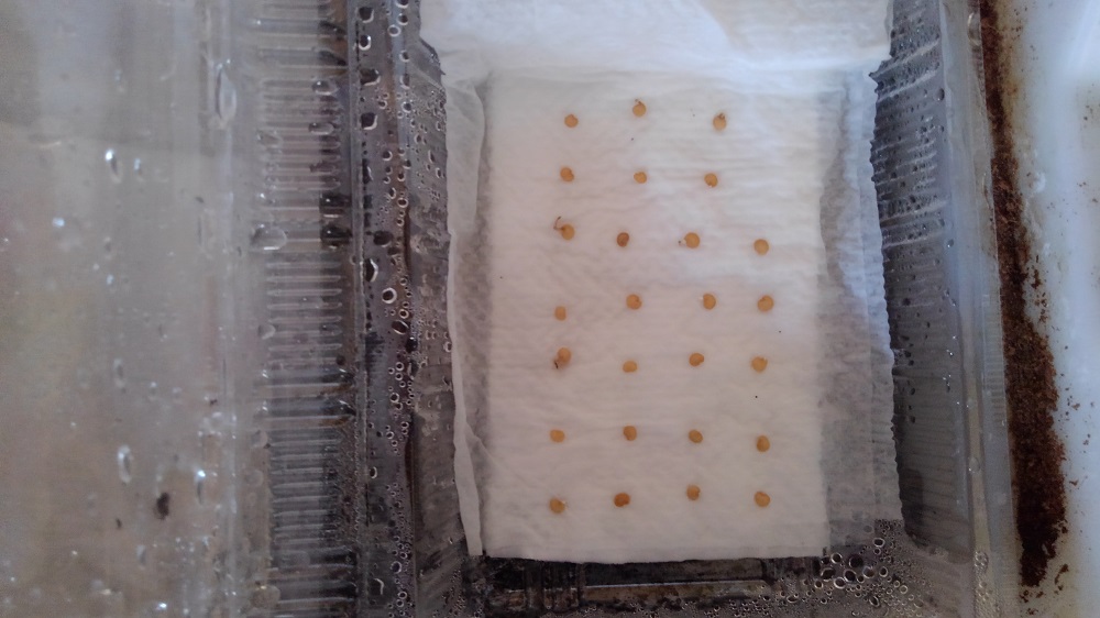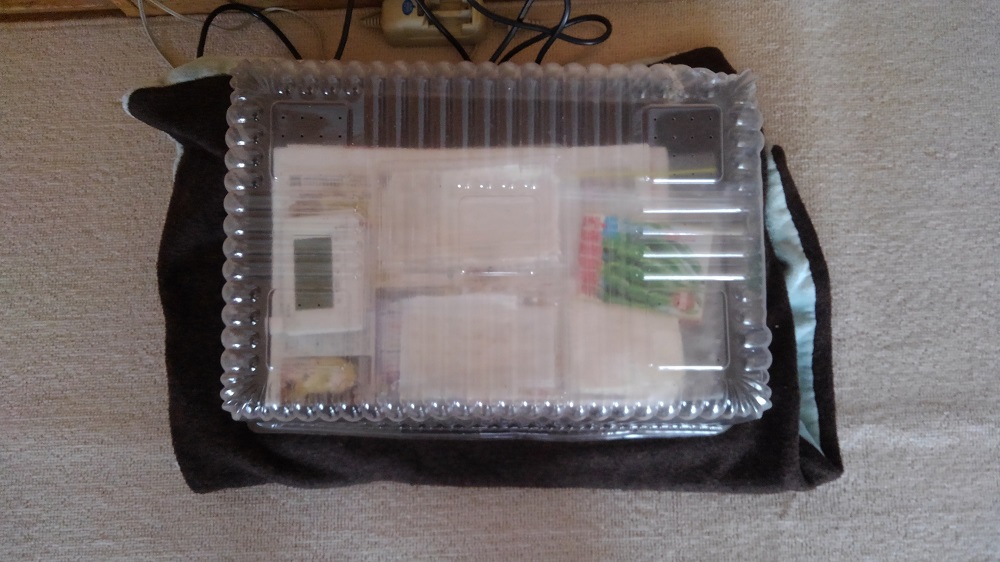 熱さを和らげるために新聞紙や毛布などでガードして、その上に透明の入れ物に脱脂綿に水を含ませ、さらにキッチンペーパーを水に濡らして種を挟みました。