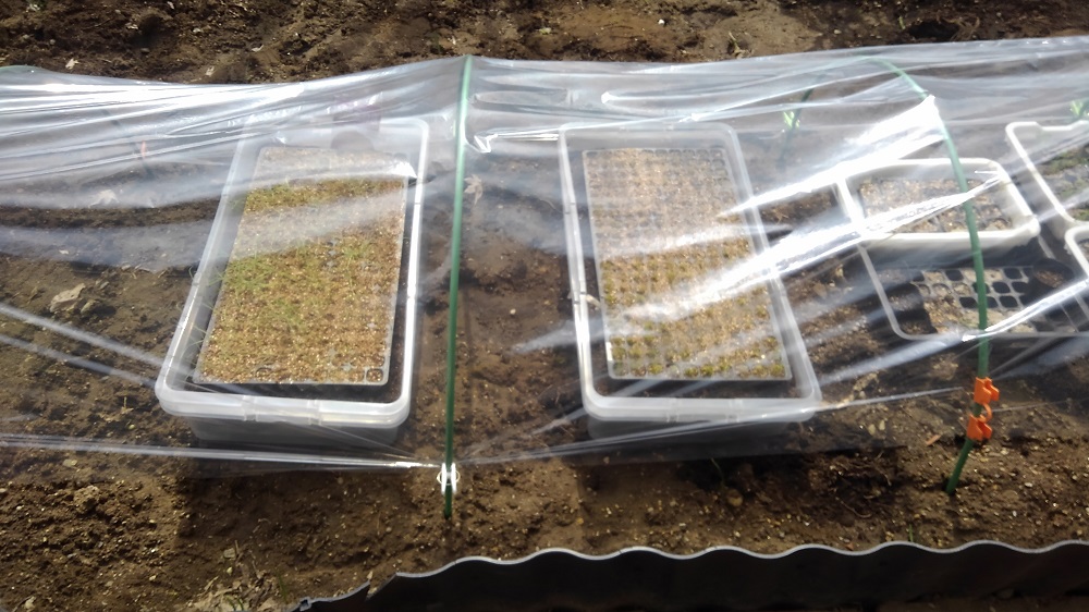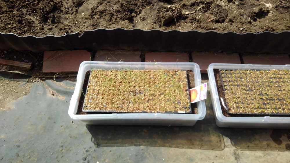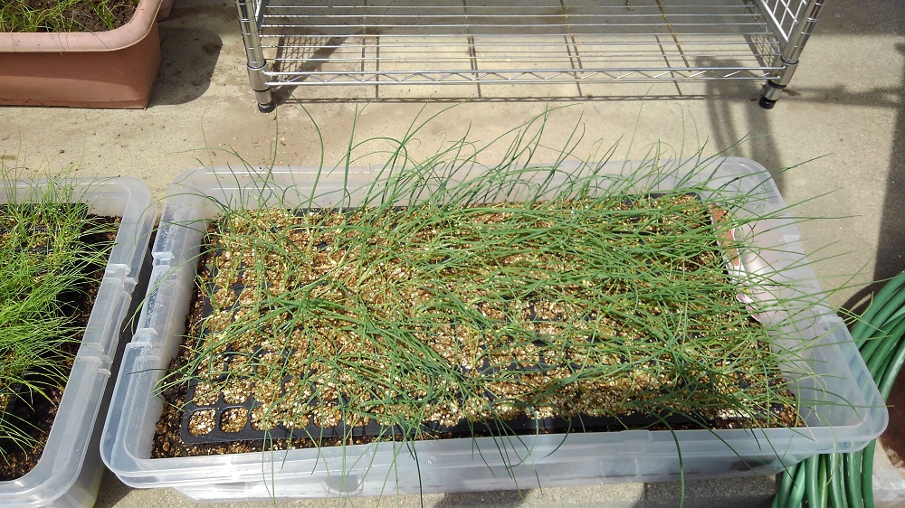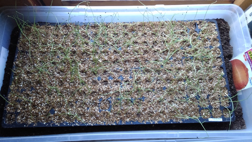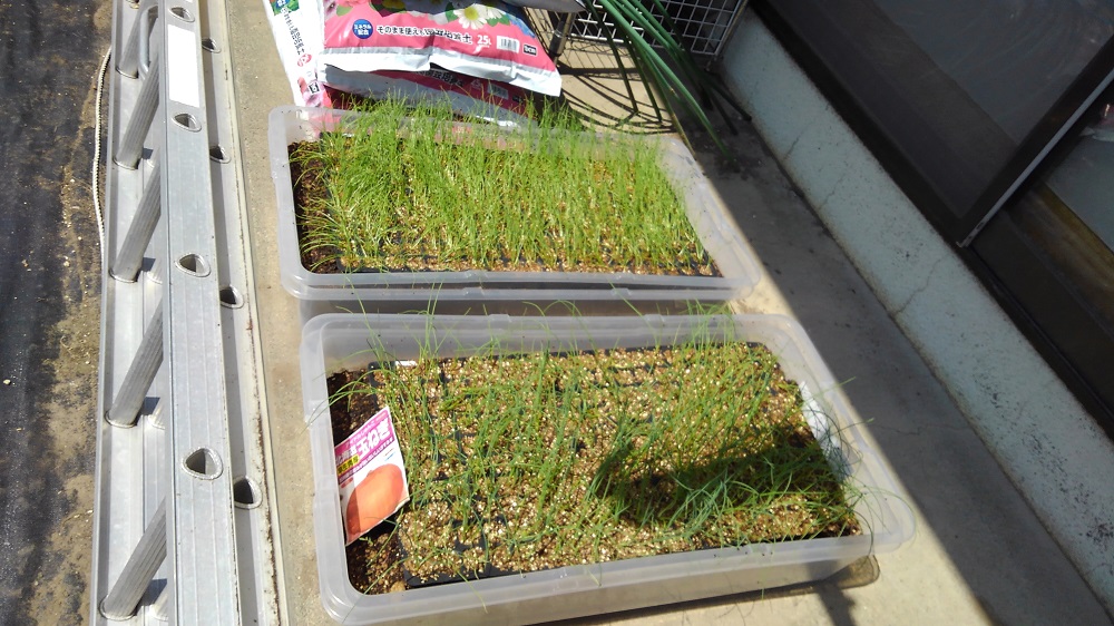 九条ネギと同様に衣装ケースに土を入れてセルトレイを載せております。