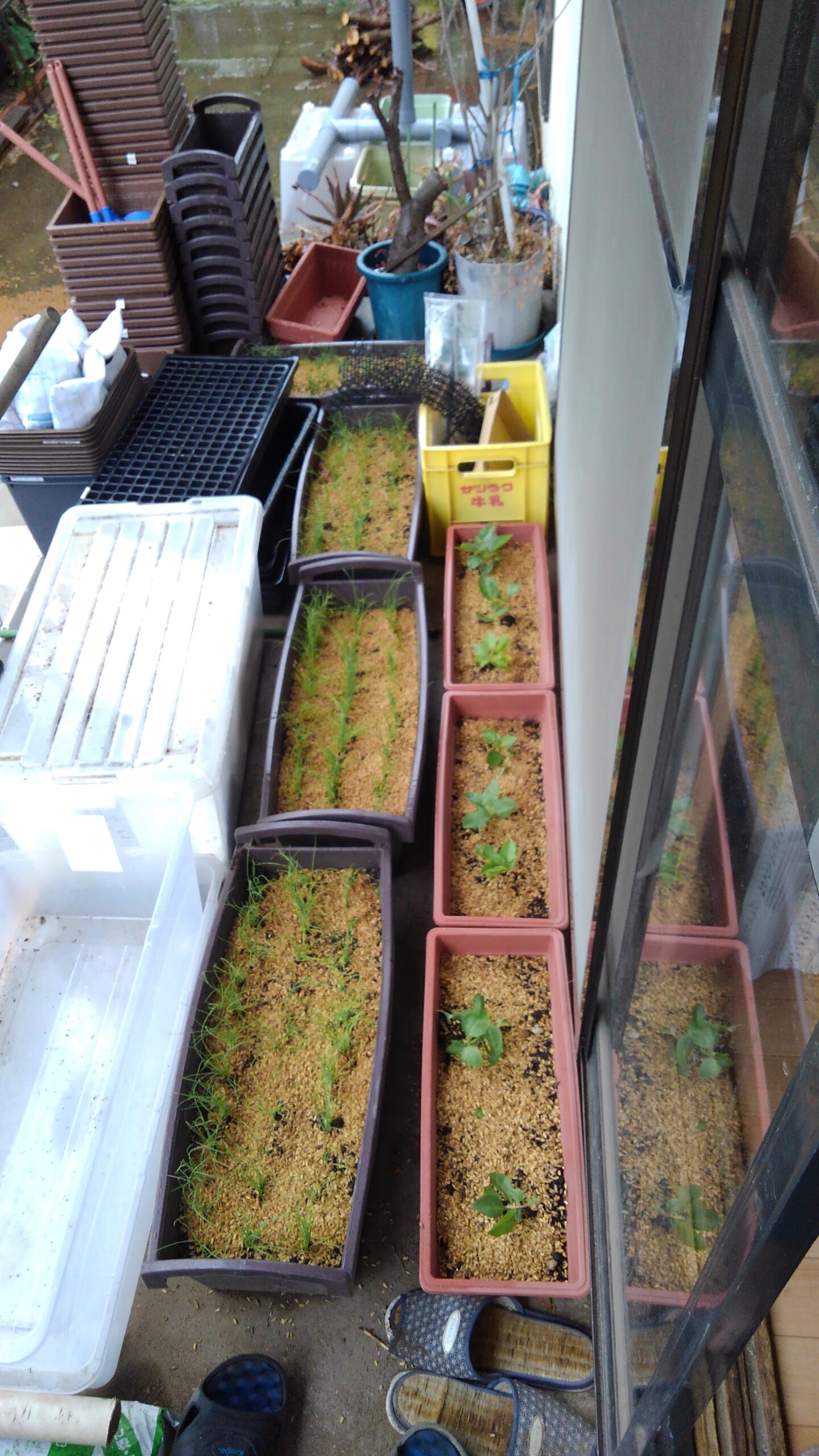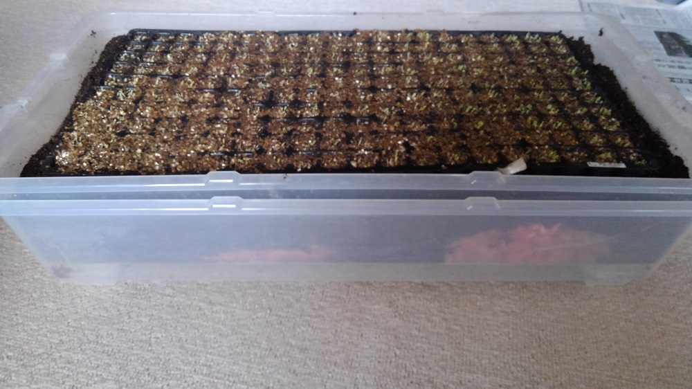 予定としてはセルトレイをそのまま畑に埋め込もうと思っていたのですが、外がまだ寒いということで衣装ケースに土を入れてその上にセルトレイを載せるという方法をとりました。